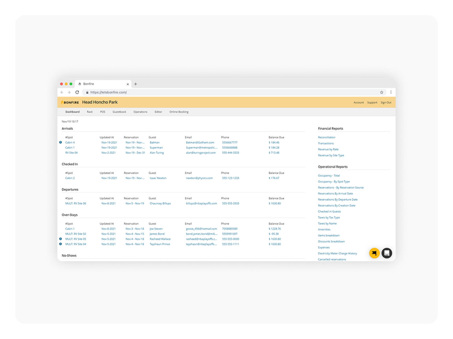Bonfire’s modern, cloud-based reservation system is easy to learn, simple to use, and accessible from anywhere. Get essential features and functions needed to manage your operations and draw insights from core industry reporting built to save you time and increase your profits.