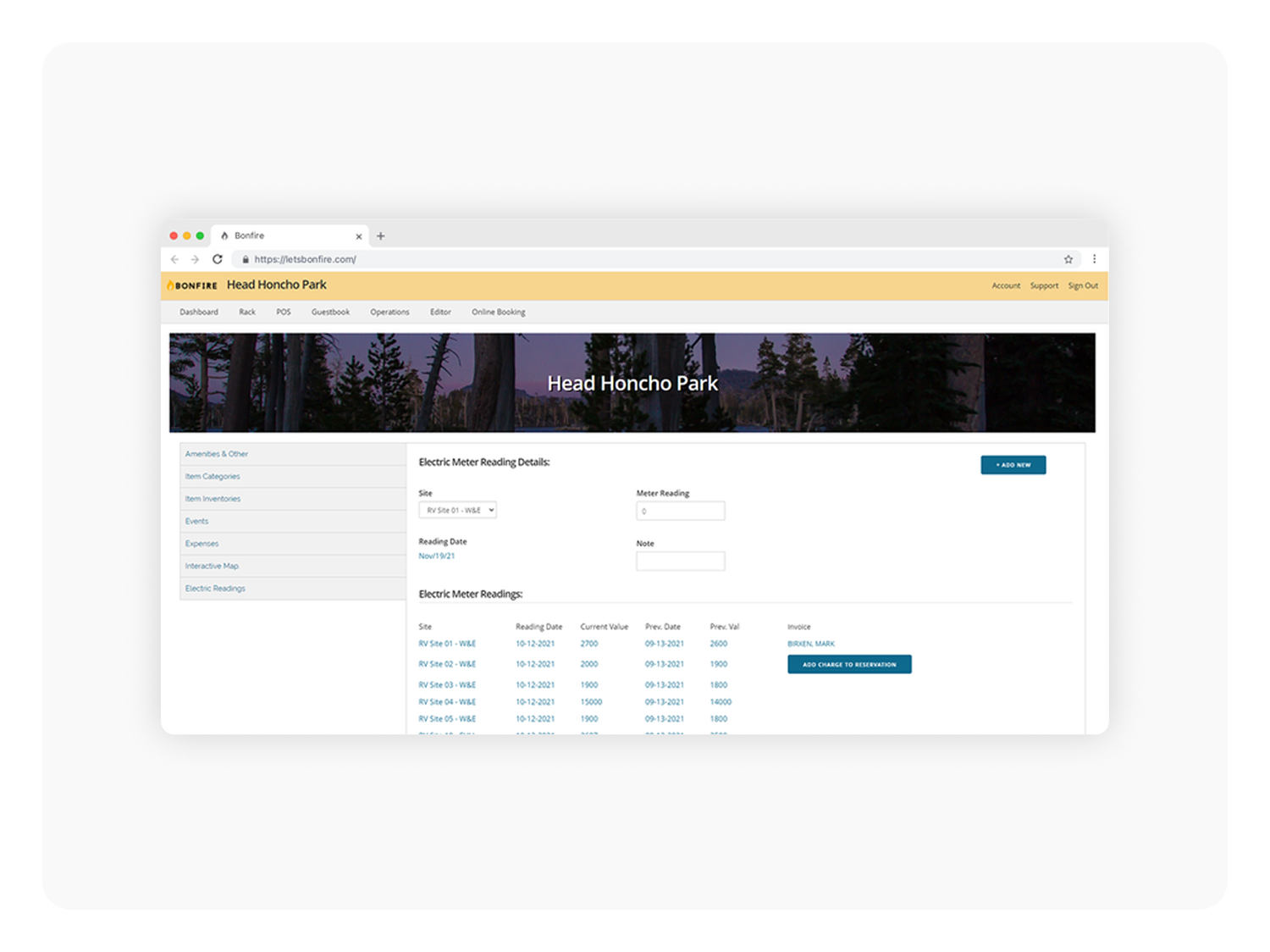 The electric meter reading module allows you to update the readings and automatically calculate charges so you can add them to specific reservations. Enter them site by site or upload all at once.