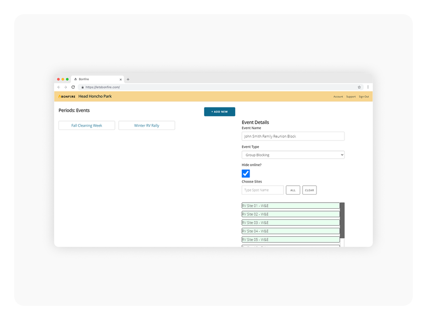 Group bookings or special events can be tedious to organize and manage. Black out certain sites for certain dates of the year to ensure availability during those special times.